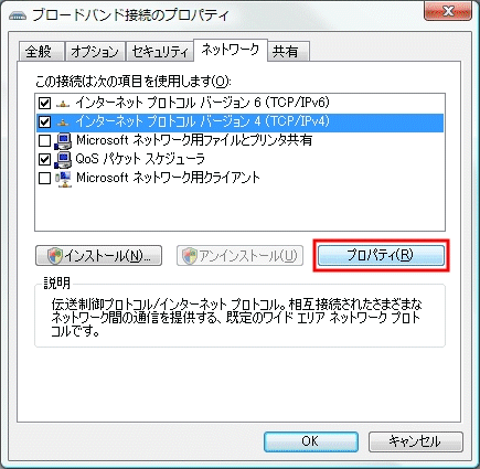 5. 「ネットワーク」タブから「インターネット プロトコル バージョン 4 (TCP/IPv4)」を選択し、「プロパティ」をクリックします。