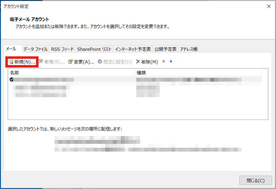 5.「アカウント設定」の画面が表示されます。 「新規(N)」を選択してください。