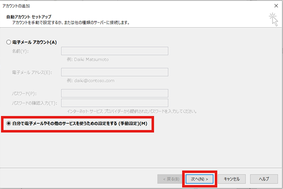 6.「アカウントの追加」 画面が表示されます。 「自分で電子メールやその他サービスを使うために設定する(手動設定)(M) 」を選択し、「次へ」をクリックします。